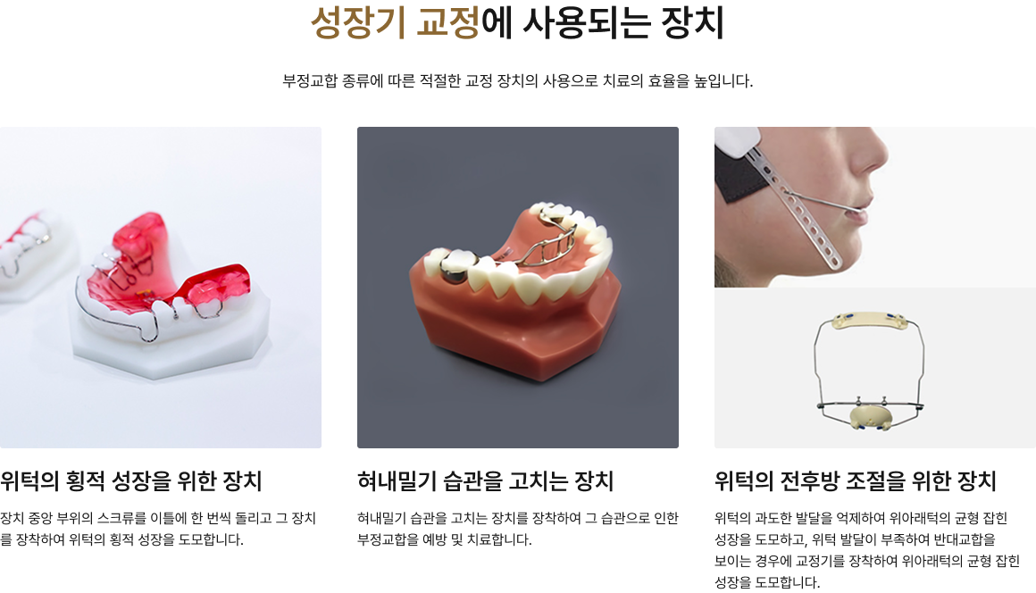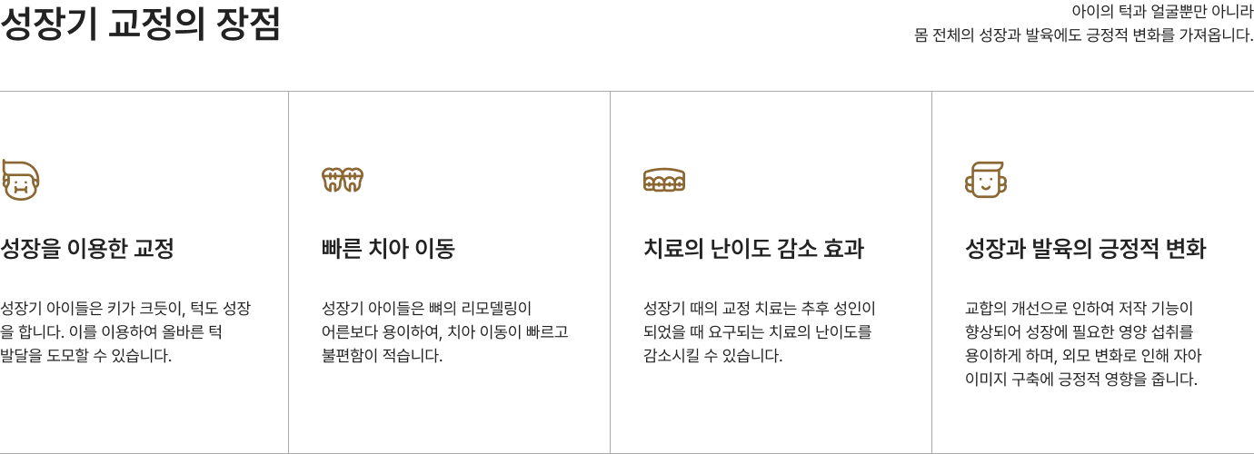 교정 치료입니다. 아이의 턱과 얼굴 뿐만 아니라 몸 전체의 성장과 발육에도 긍정적 변화를 가져옵니다.